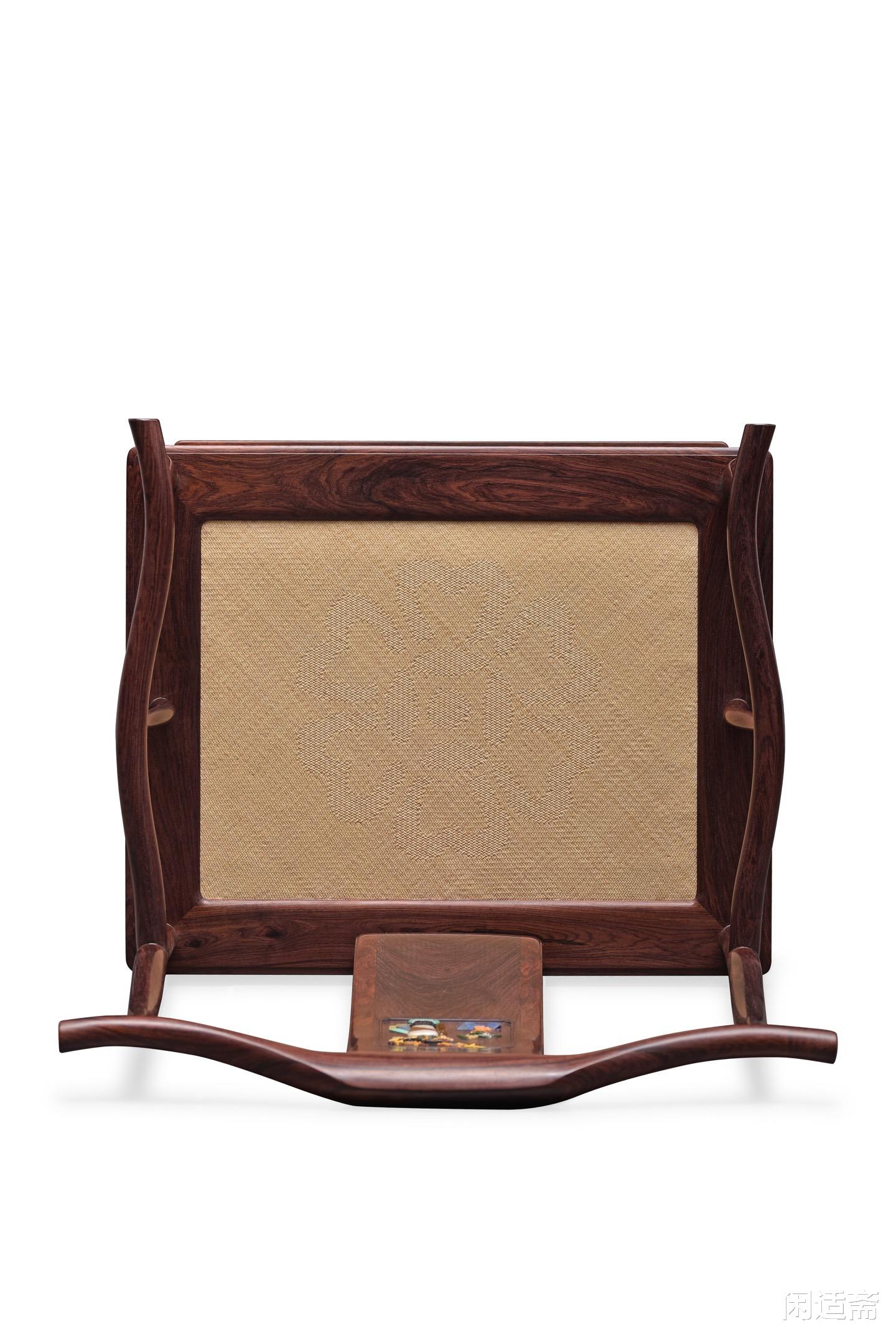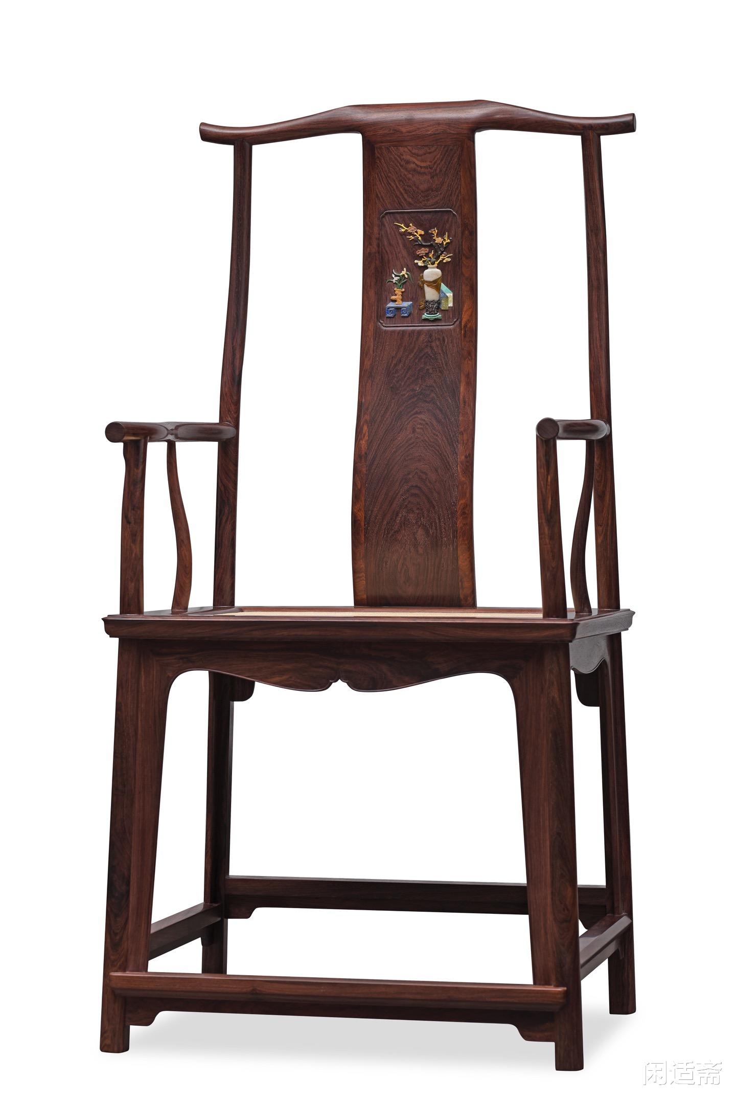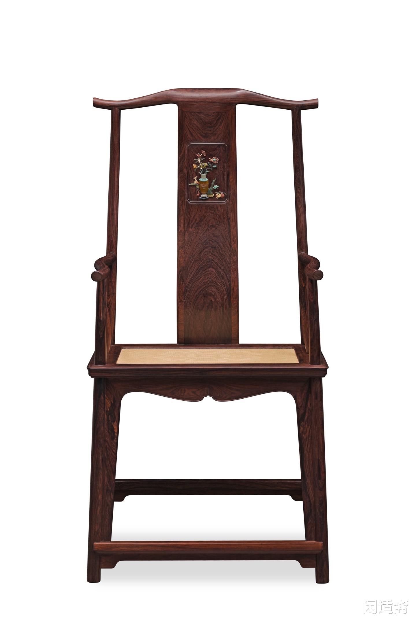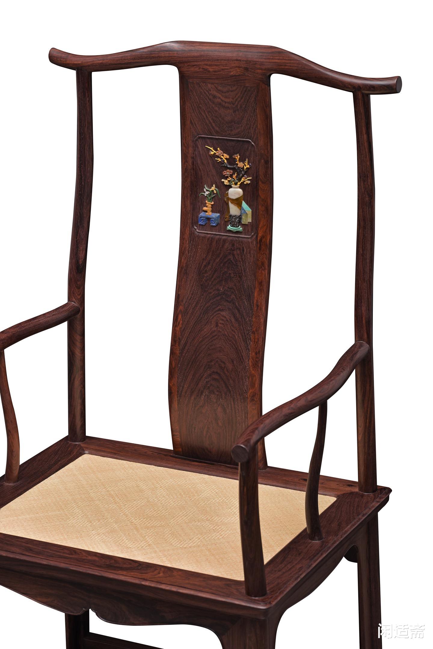 靠背板为整料开光设计,其上采用百宝嵌工艺雕琢“四君子”清供图案,是整件器物的点睛之笔。工匠甄选螺钿、象牙、寿山石、绿松石等多种珍材,经精细裁切、打磨、镶嵌,每一处细节都精益求精。图案色泽清雅,层次分明,梅兰竹菊四君子形态各异、栩栩如生,既彰显君子谦谦之风,又承载着高洁清雅、温润如玉的美好寓意,传递出文人雅士的精神追求。