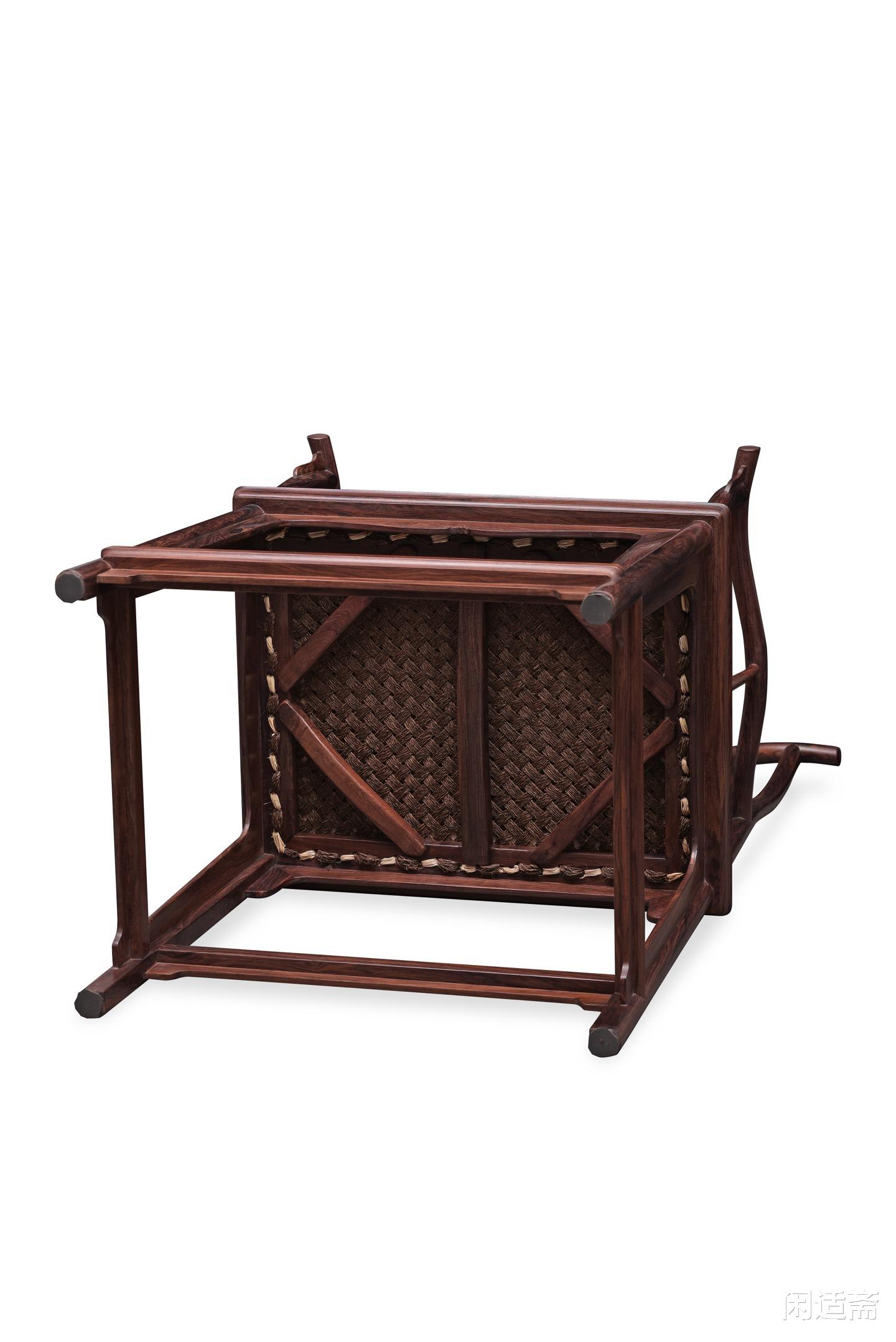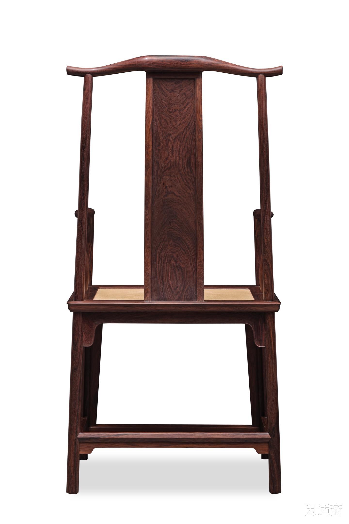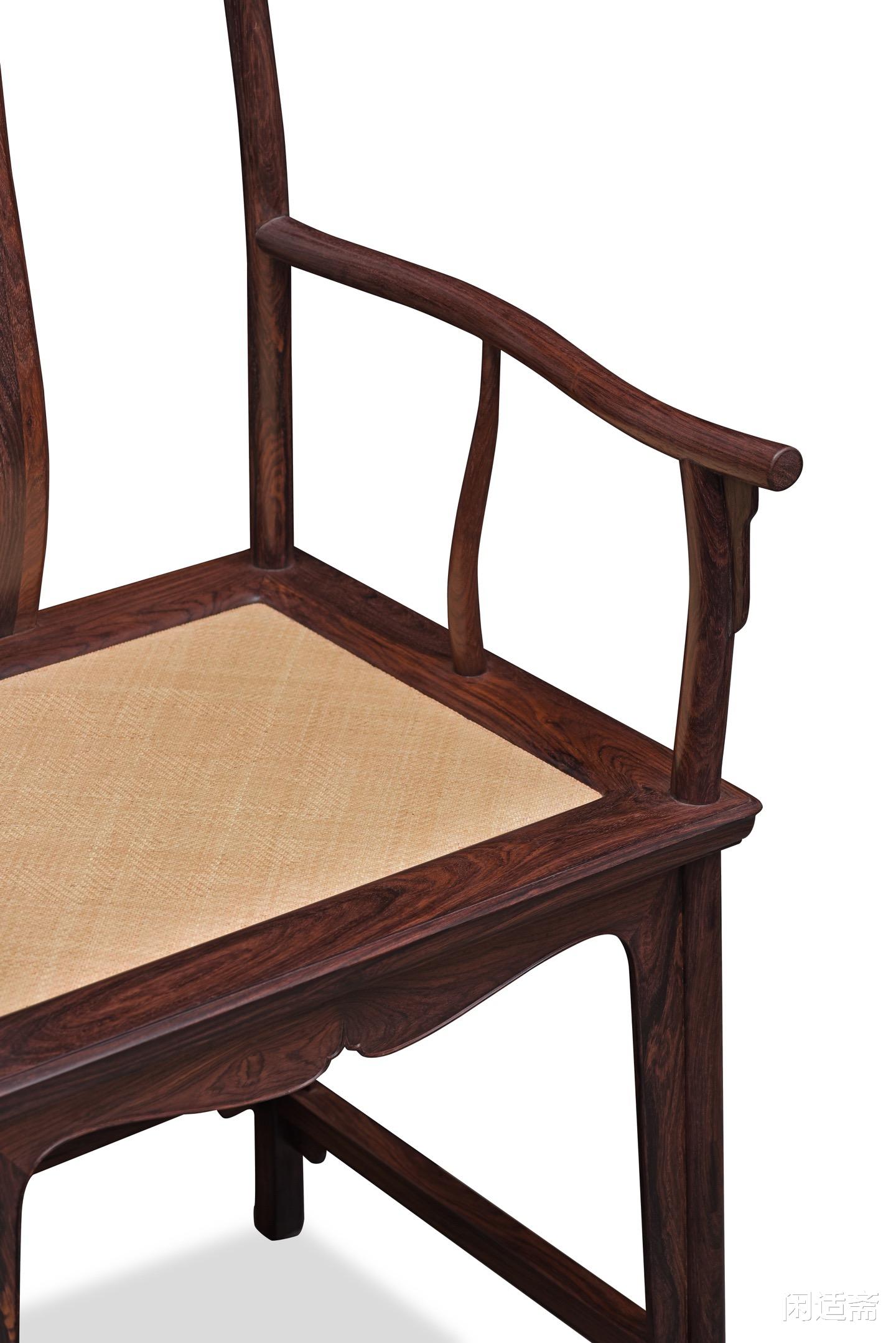 椅形恪守经典明式四出头官帽椅形制,端方大气,线条刚劲流畅,无一丝冗余雕饰,完美诠释明式家具“简约而不简单”的精髓。搭脑与扶手前端四端出头,线条利落挺拔,尽显器物的庄重威仪;椅身框架衔接严丝合缝,榫卯结构精巧坚固,保证了使用的稳固性,又彰显了古人“天人合一”的营造智慧,坐感舒适贴合人体工学,兼具文人风骨的温润与礼制器物的庄重。