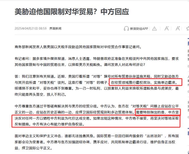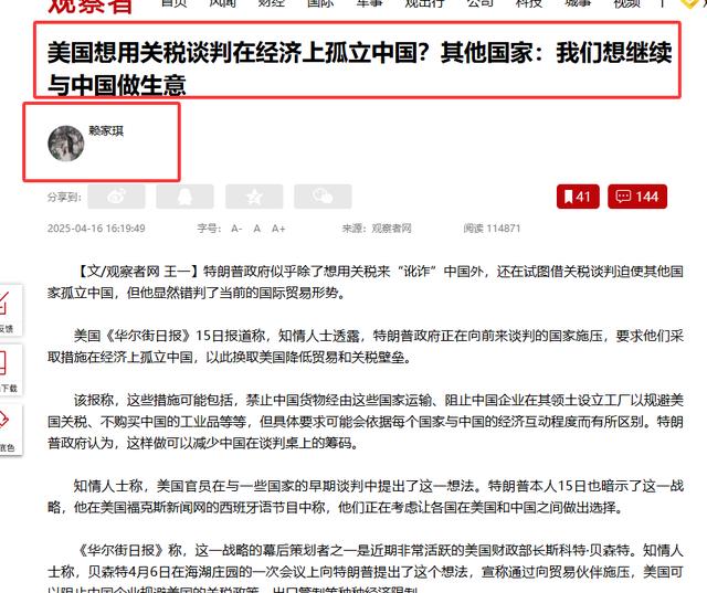 面对特朗普政府企图通过关税谈判的措施对其他国家施压来打压中国的“真实意图”。