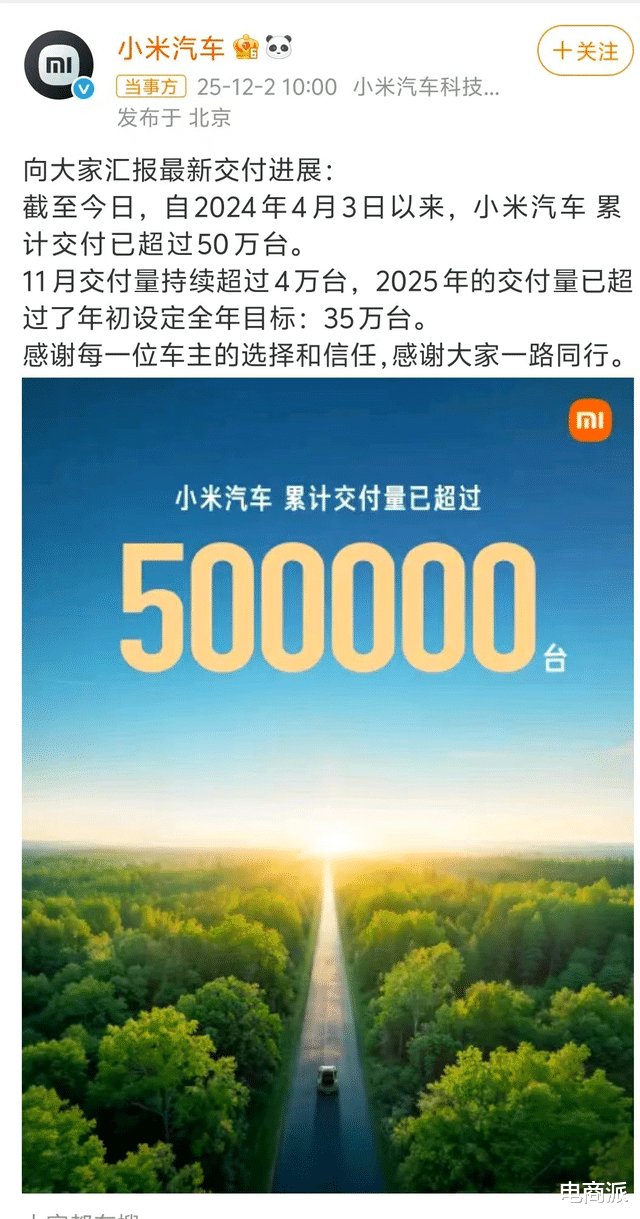 12月2日,小米汽车发布了一份亮眼的交付战报:截至今日,自2024年4月3日以来,小米汽车累计交付已超过50万台。11月交付量持续超过4万台,2025年的交付量已超过了年初设定全年目标:35万台。
