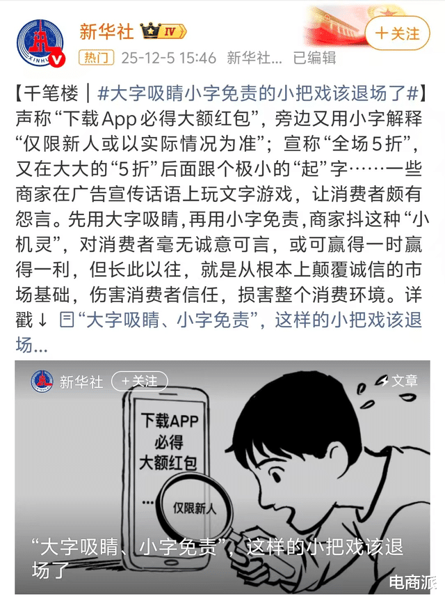 近日,新华社刊发题为《“大字吸睛、小字免责”,这样的小把戏该退场了》的评论文章,直接向厂商惯用营销套路开炮了。