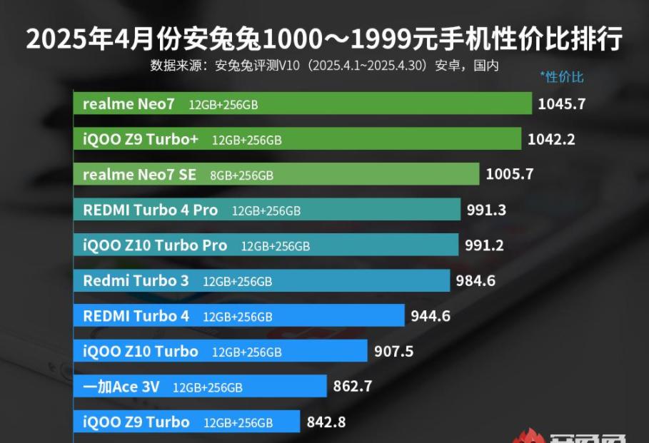 不可否认红米Turbo4Pro性价比很高,销量更是高了,但论性价比的话,在目前的千元机市场中,并不是红米Turbo4Pro最高的,在安兔兔最新的性价比排行榜中,1000到1999元价价位上,红米Turbo4Pro在榜单仅排第4名,前三名分别是realme真我Neo7,iQOOZ9Turbo+,真我Neo7SE。