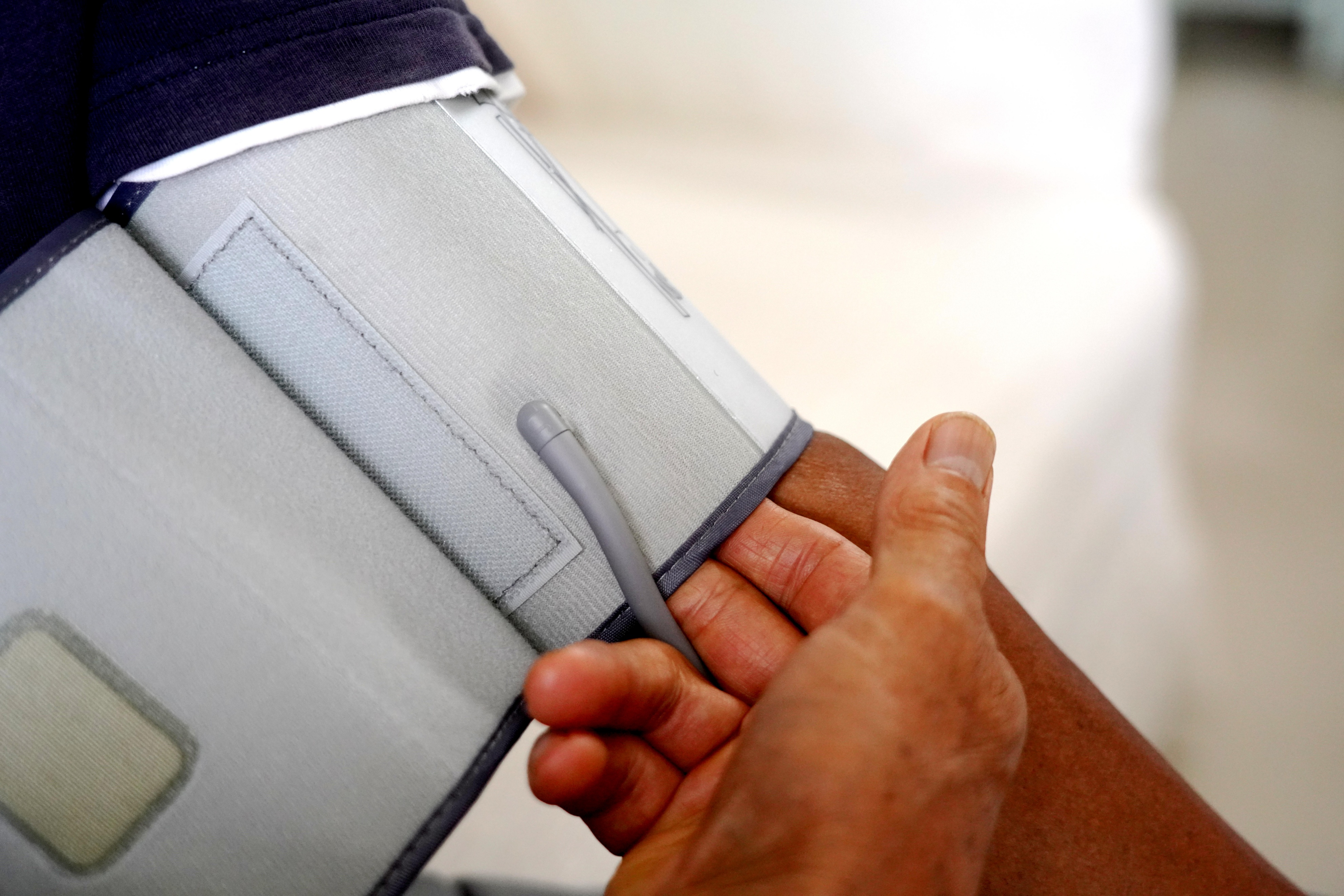 这款机器的臂带是360°环绕均匀施压的,测量过程中能完全贴合手臂,减少测量误差,注意测量前留出两个指头的预留空间即可。