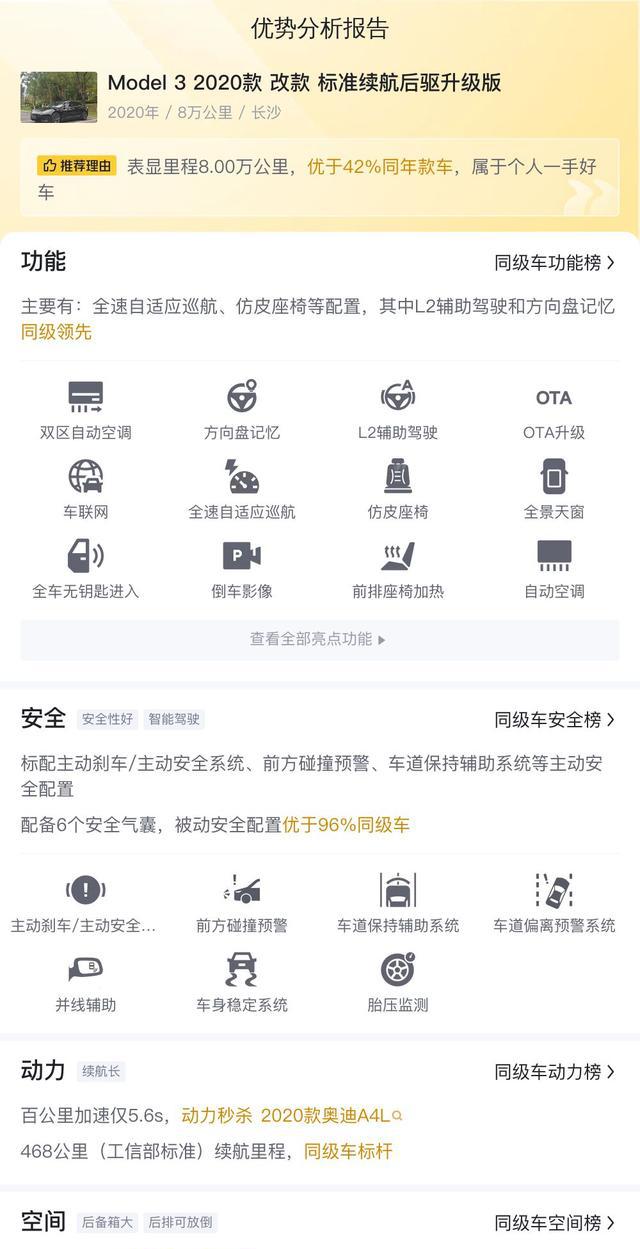 再来看这辆车的配置,特斯拉为其配备了全速自适应巡航、L2辅助驾驶、仿皮座椅等诸多技术先进的配置。这些配置可能在其它品牌车型中司空见惯,但放在一款二手车中,却显得尤为珍贵。特别是L2辅助驾驶技术,为驾驶者提供了极大的便利,消除了繁琐的驾驶操作,让驾驶变得更加轻松。加上它具有的卓越动力性能,Model 3的百公里加速可达到5.6秒,这一成绩足以秒杀许多传统燃油车。在与2020款奥迪A4L等车型的比较中,Model 3的动力参数和加速能力无疑是让人瞩目的。这种表现使得它不仅适合日常代步,更是短途旅行的理想选择。