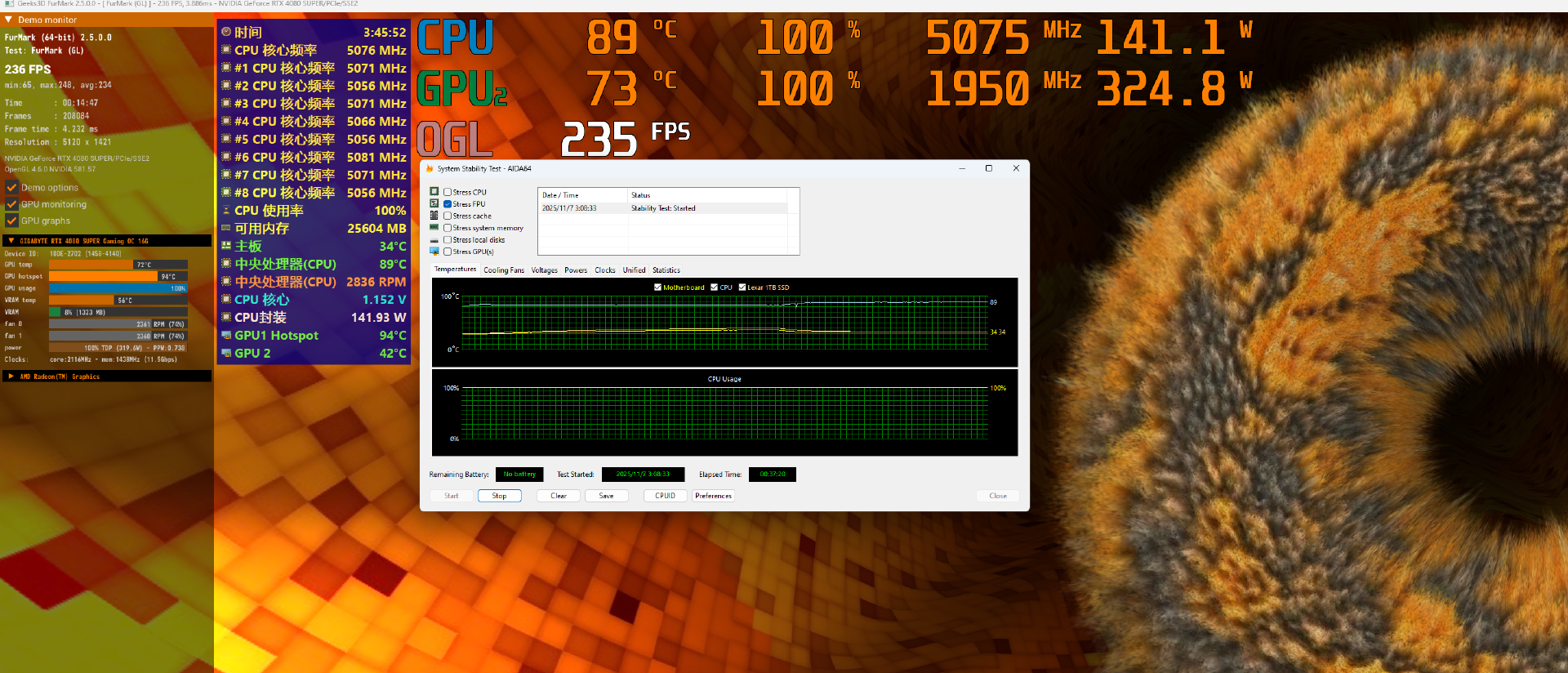 通过AIDA64单烤FPU+FURMARK 2.0实测,在室温20℃的情况下,CPU最高温度为89℃(全核5.1GHz,电压为1.115V),GPU核心最高温度为73℃(功耗为325W)。