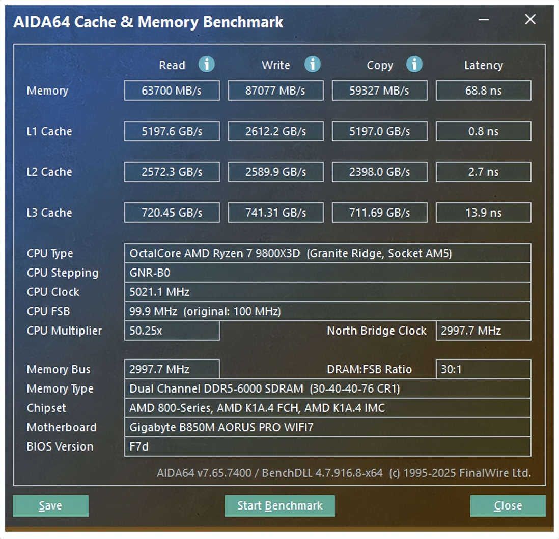 开启EXPO+XMP/EXPO高频宽,通过AIDA64测试读取速度为63700MB/s,写入速度为87077MB/s,复制速度为59327MB/s,延迟为68.8ns。