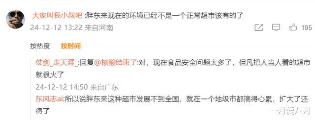 下面有网友立刻回复说:为什么会出现这种情况?归根结底是因为有关部门对食品安全监管不利,百姓没有安全食品的购买渠道。胖东来之所以火,不是因为他产品有多好,而是因为其他地方的产品太差。