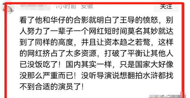 “看了他和华仔的合影就明白了王导的愤怒,别人努力了一辈子一个网红短时间莫名其妙就达到了同样的高度,并且让资本趋之若鹜,这样的网红挤占了太多资源,打破了平衡让其他人已没饭吃了!国内其实一样,只是国家大好像没那么严重而已!没听导演说想翻拍水浒都找不到合适的演员了!”