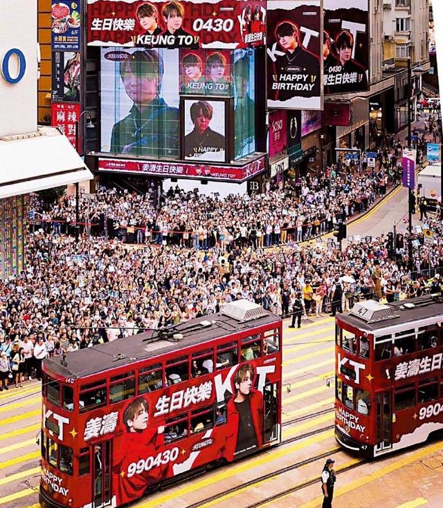 我们从王晶晒出的图能够看到,有商场的大屏幕还有公交车的外立面,每一个应援下面都站满了人,警察都不得不出动维持秩序。