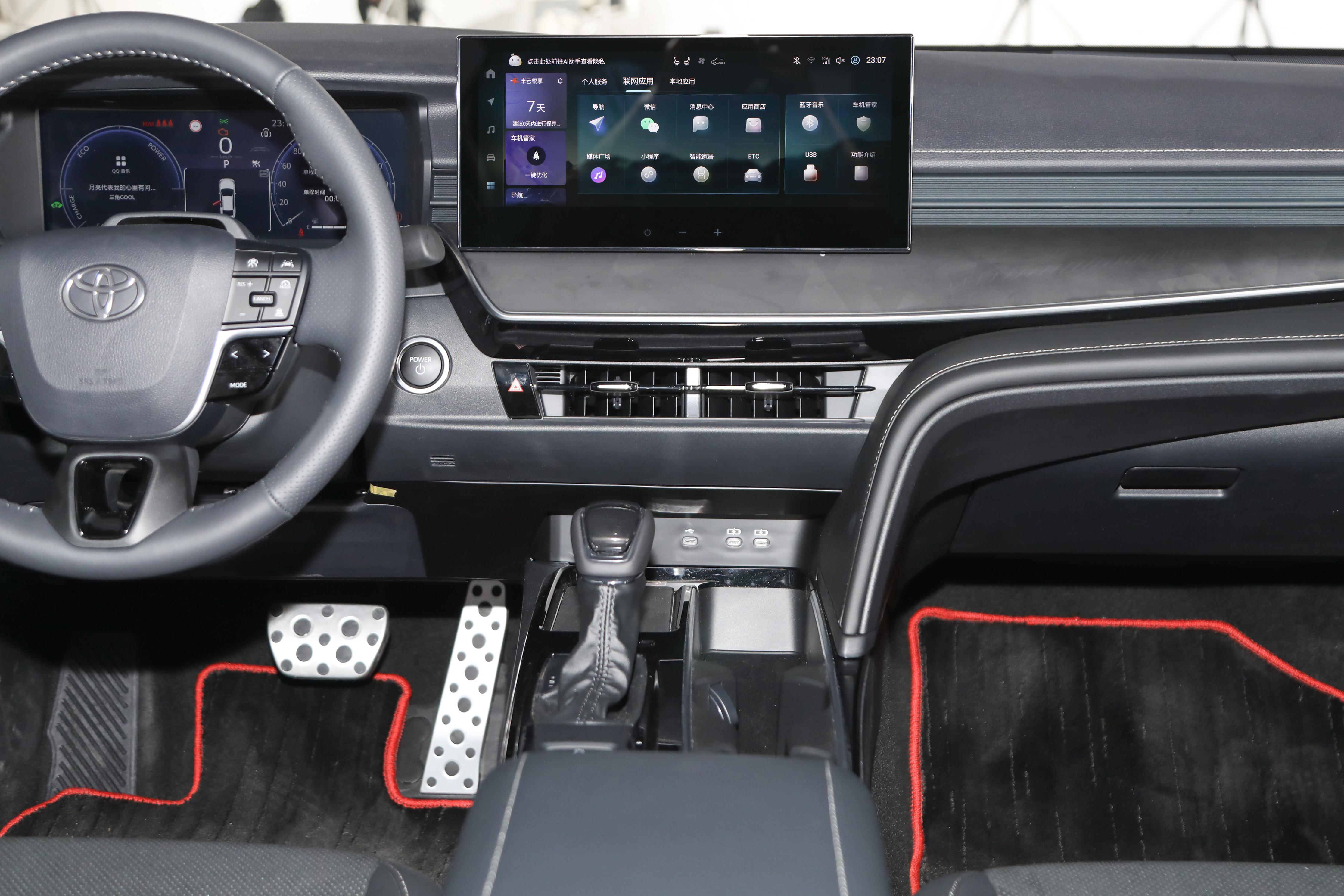 凯美瑞双擎2.0HS运动版则配备HUD抬显、12.3英寸仪表盘和12.3英寸中控屏,中控屏下方还预留了触摸式按键,车机则内置高通骁龙8155芯片,操作流畅度得到改善,它支持语音连续识别、声纹识别和主副驾语音控制,未提供手势控制、车载KTV、WiFi热点连接等功能,不过可以通过carplay、carlife、HUAWEI hicar多种方式实现手机互联映射,其他方面提供15W手机无线快充、单色氛围灯、8个扬声器等。