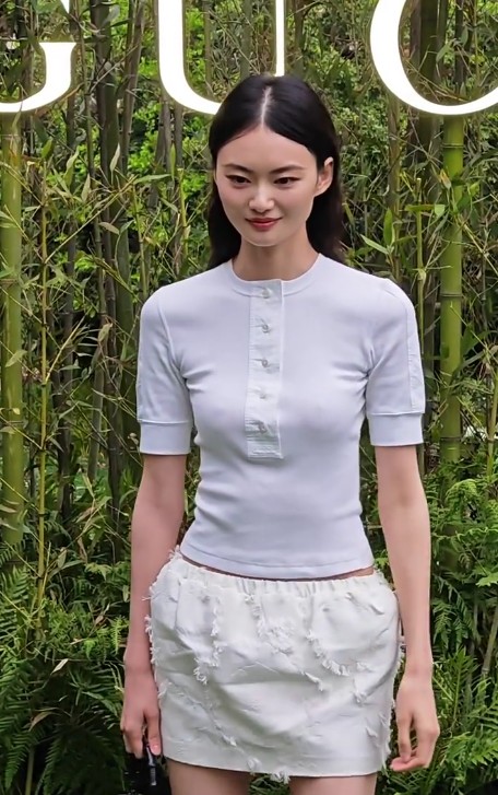 Gucci作为知名时尚品牌,自然要和不少模特合作,这次除了明星,超模贺聪也去了现场。而且与李沁、文淇的一身黑不同,贺聪身穿白色T恤和短裙,造型十分清新。