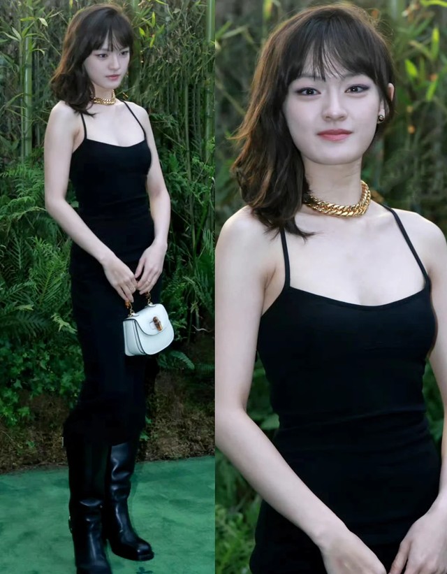 这次上海的Gucci之夜,文淇身穿一件黑色吊带裙,造型十分火辣,再配上金属项链,十分朋克风,妆造看上去也像只小猫一样。