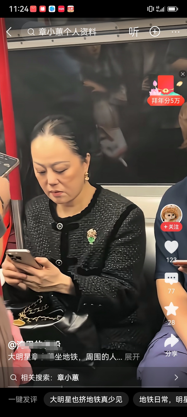 近日春节期间,有一张疑似章小蕙小姐坐地铁的视频在网络上流传,有一些网友不认可这是章小蕙,有一些网友肯定是章小蕙,网上展开了大讨论。