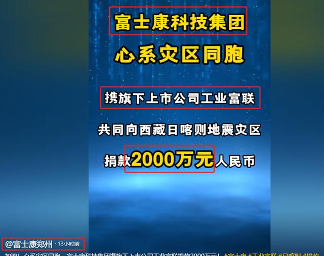 紧接着富士康集团捐赠2000万的消息也传了出来。