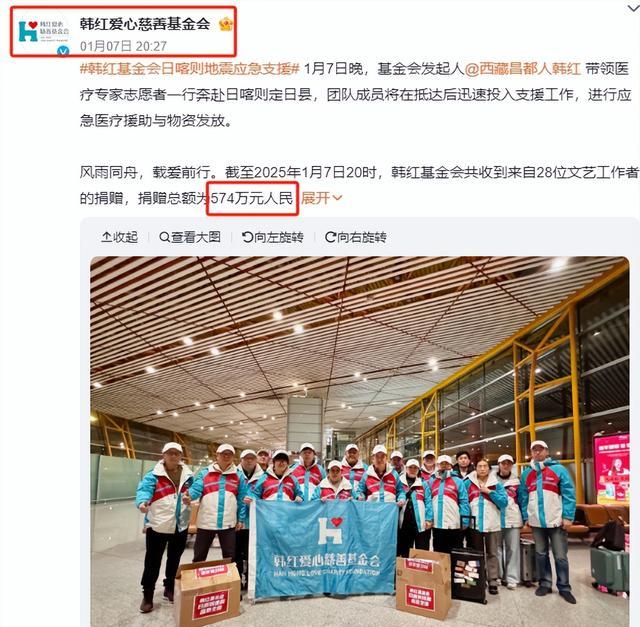因此,韩红在得到日喀则当地救援队的准许后,才在7日深夜带领医疗队进入前往了灾区。