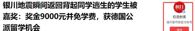 信息来源:极目新闻2025-01-07 银川地震瞬间返回背起同学逃生的学生被嘉奖:奖金9000元并免学费,获德国公派留学机会