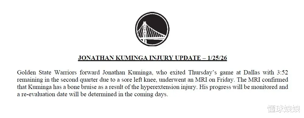 不曾想只打了2场就受伤了,今天勇士官方宣布,库明加确定为左膝过度伸展导致骨挫伤,具体缺战时间还不确定,需要等几天后复查。