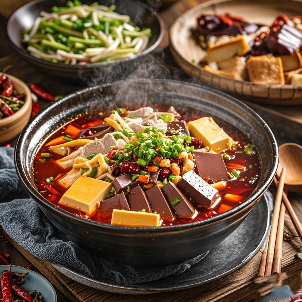 毛血旺,这道菜可是重庆江湖菜的代表之一。它起源于重庆磁器口,最初是船工们的食物。那时候,船工们把一些便宜的食材,如鸭血、毛肚、午餐肉等,放在一起煮,慢慢就形成了现在的毛血旺。