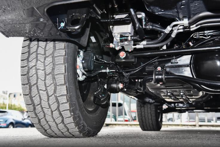 再说“差速锁”。讲人话,车轮就像你的两只脚。正常走路时,一只脚迈出去,另一只脚作为支撑。但如果一只脚踩在香蕉皮上(打滑了),负责支撑的那只脚就没法发力,你就动弹不得。差速锁的作用显而易见,就是把两只脚“绑”在一起,让有抓地力的那只脚带你走。但也要注意,差速锁是临时脱困装置,设计初衷是在车辆陷入困境时短时间使用,将动力均匀分配给两侧车轮,而非集中全部动力到单侧车轮,且主流硬派SUV搭载的差速锁系统通常配备自动解锁机制,当系统检测到恢复正常行驶条件后会自动解锁,以防造成不可逆的机械磨损。新手选车或租车,至少要有后桥差速锁。这是脱困最核心的配置。没有它,陷车了只能干瞪眼。