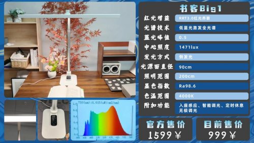 与此同时,书客还特创了整个行业中保持领先水平的RRT2.0红光养眼技术、SunSilk™护眼芯片、硬件级低蓝光技术等,通过科学光谱优化和精准芯片排布,多维度还原接近自然光的光谱结构,实现降低90%近视风险的同时还能缓解81%的用眼疲劳。与千元护眼台灯实测对比,护眼效果相差不足1%,堪称越级打击。