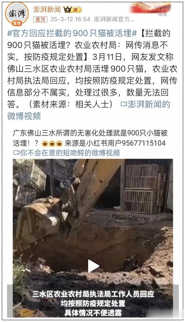 3月11日,网友上传视频指控“佛山三水农业农村局活埋900多只猫”,立即引发病毒式传播。