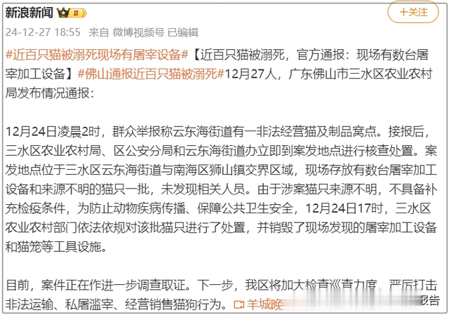 佛山市、区两级农业农村局迅速回应:核查辖区无此记录,并呼吁公众举报视频源头。佛山市伴侣动物保护协会实地调查后也确认,三水区未见异常。