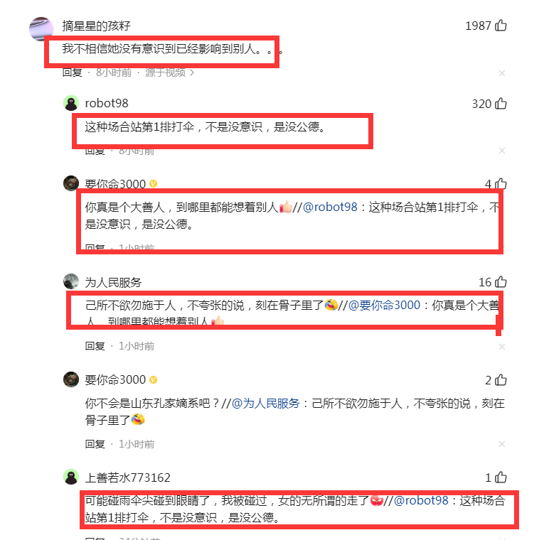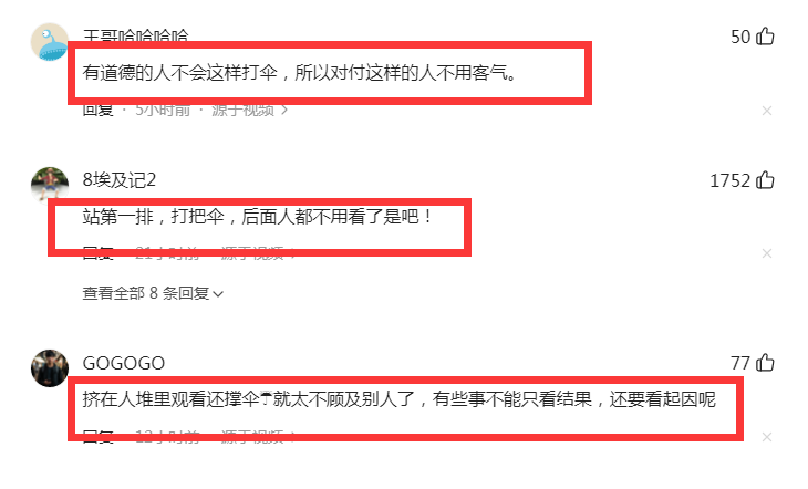 这则视频在网上火了,不少网友发表了自己的看法,但却是一面倒,很多人都觉得这女子的不是,在人多的地方打着伞,不仅遮住别人的视线,还拿雨伞动来动去,刮到人都不知道!不知是有意还是无意?