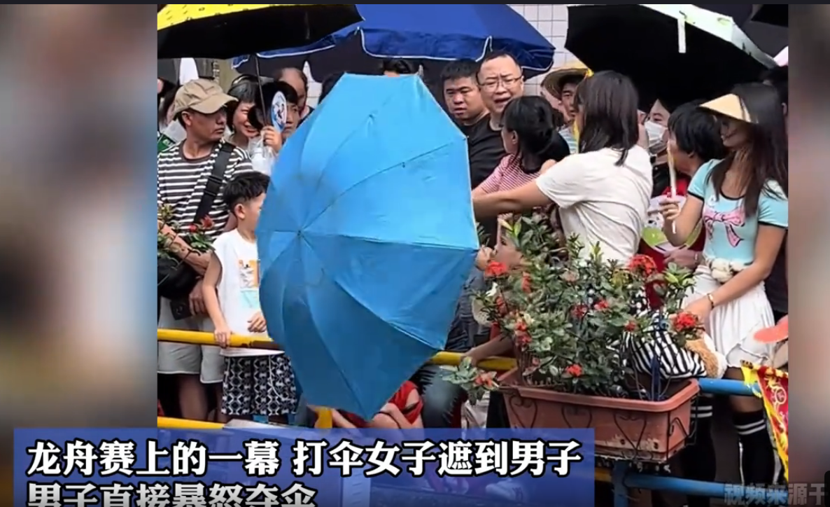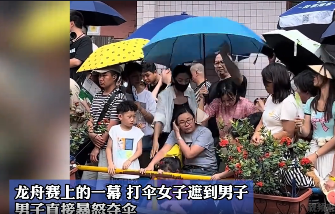 网上一则视频突然爆火,这视频发生在龙舟比赛的场外,一位打伞的女子由于遮住了男子,男子直接暴怒夺伞一丢,这时幸亏旁边一个白衣女子眼疾手快地把伞拽了回来!