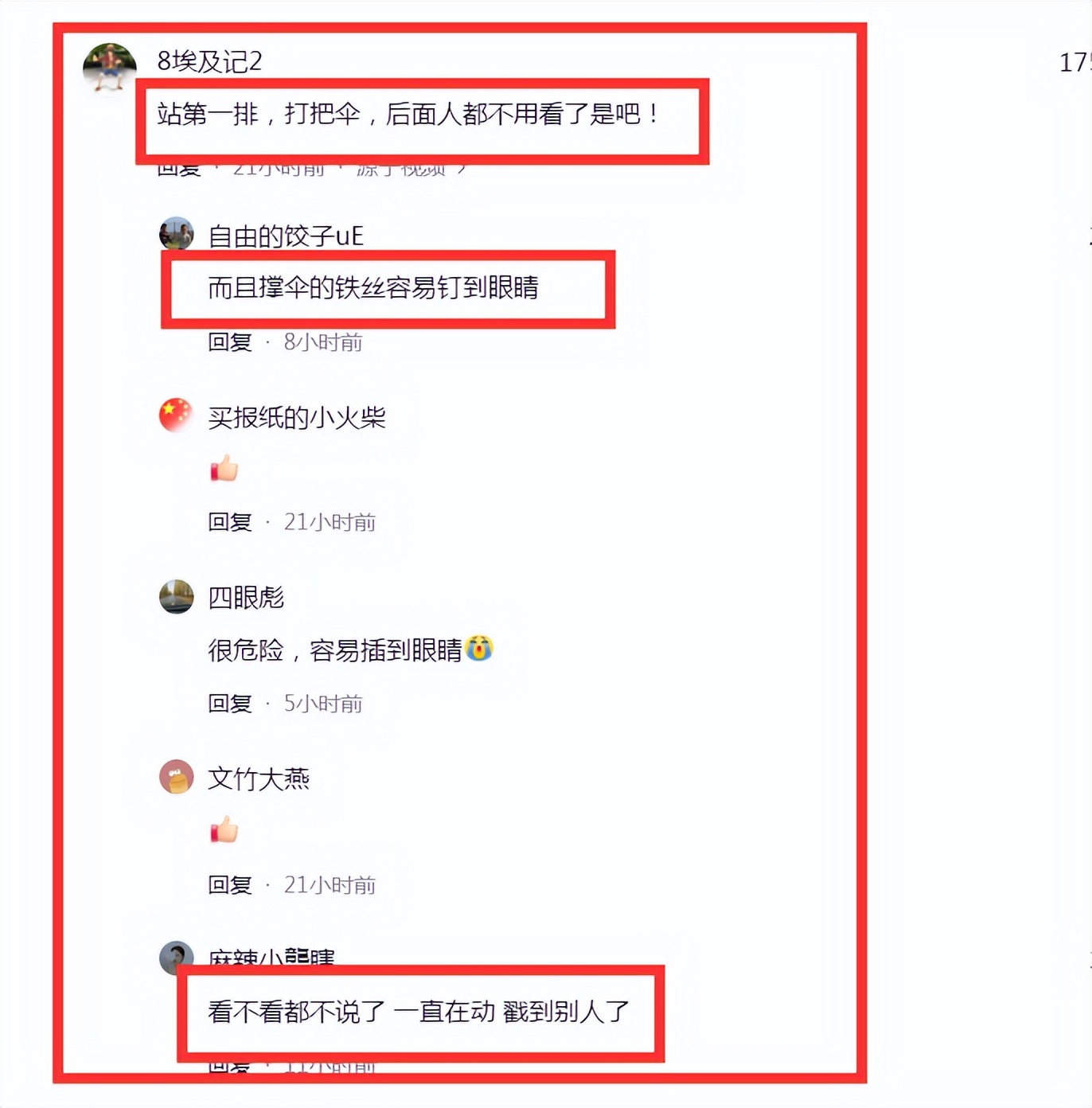 更多的网友说道,站在第一排打把雨伞,后面人都不用看了,不仅不用看,而且撑伞的铁容易钉到别人的眼睛!