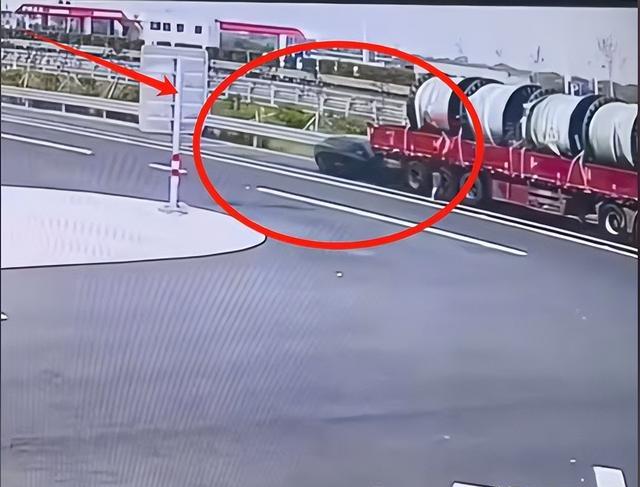 就在货车司机站货车后轮上,检查最后一卷货物时,一辆特斯拉轿车从远处驶来,直愣愣的撞在了货车尾部。