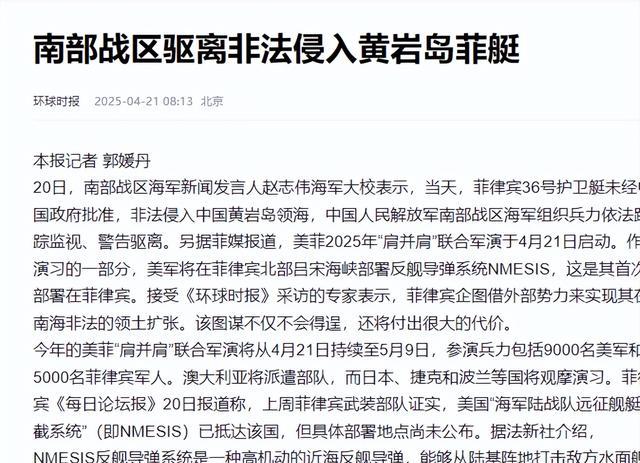 信息来源:环球时报2025-04-21南部战区驱离非法侵入黄岩岛菲艇