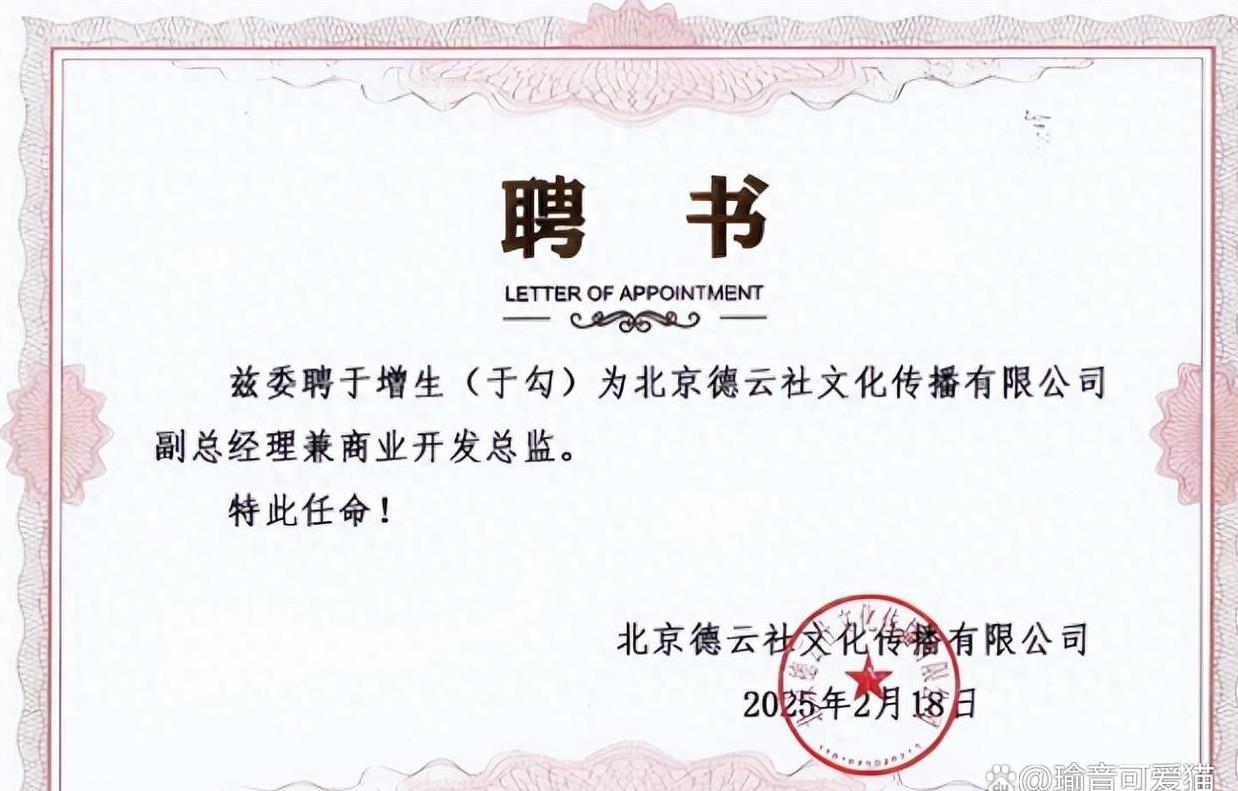 凌晨,于勾在多个社交平台晒出了德云社的聘书。聘书很短:“滋委聘于增生(于勾)为背景德云社文化传播有限公司副总经理兼商业开发总监”。但是不少人猜想,德云社这是打算继续扩圈的节奏,毕竟这位总经理主要涉猎的就是商业和餐饮圈子。