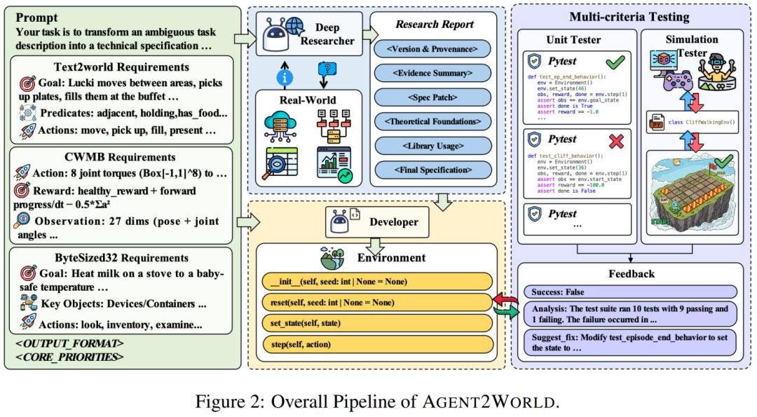 Agent2World 的核心不是 "多拉几个 agent 聊天",而是把世界模型生成拆成软件工程式三阶段:Researcher 补规格、Developer 做实现、Testing Team 用单测 + 仿真交互做行为级验收,并把验收反馈反哺修复。