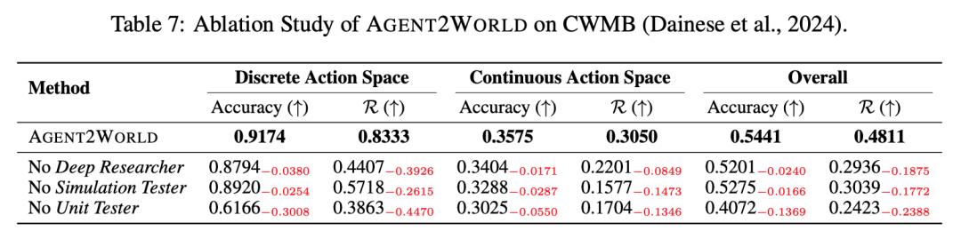 缺一不可的双引擎(基于 CWMB 验证) 为了探究 Agent2World 卓越性能的来源,团队在 CWMB(物理控制) 任务上进行了严苛的组件消融实验。结果证实,Deep Researcher 与 Testing Team 均是构建高可靠世界模型不可或缺的组件:
