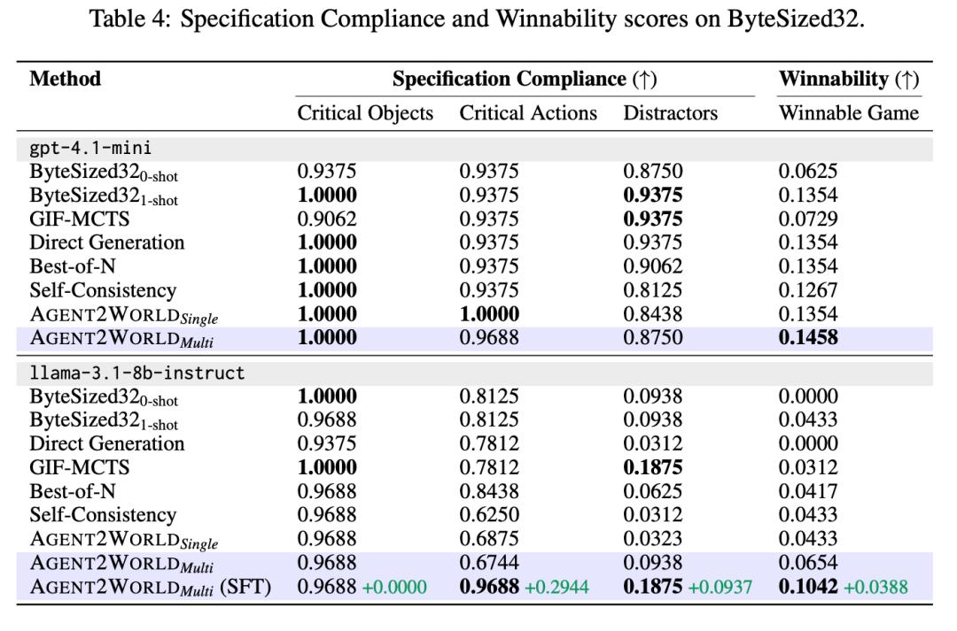 基于自主合成的高质量轨迹数据(训练仅使用 Model Developer 轨迹),团队对 Llama-3.1-8b-instruct 进行了监督微调。实验表明,这种 “以 Agent 养 Model” 的策略带来了显著的泛化能力提升:微调后的模型在未见过的测试任务(Unseen Tasks)上,平均相对性能提升了 30.95%。特别是在 Text2World 任务中,模型生成的代码可执行率(Executability)提升高达 16.9%。这有力证明了,无需依赖昂贵的超大模型,仅凭小参数模型配合优质的 “自我修正” 合成数据,也能实现向高性能世界模型构建者的跨越。