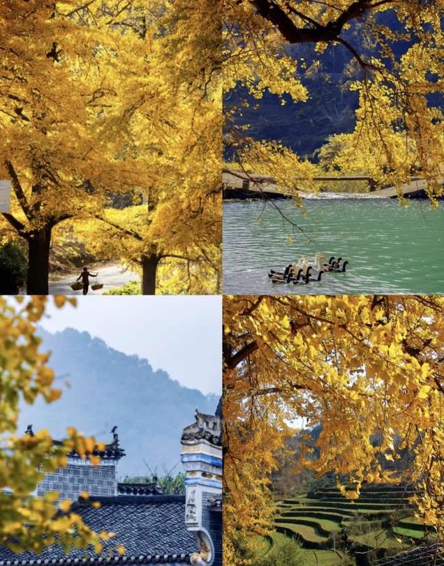 景区一头一尾的银杏树比较多且高大,配合着小亭子以及村舍特别出片,很有古典韵味,随着一阵风吹来,银杏雨落下的时候,真的太梦幻,太美了,我愿堪称“秋日赏银杏天花板”。