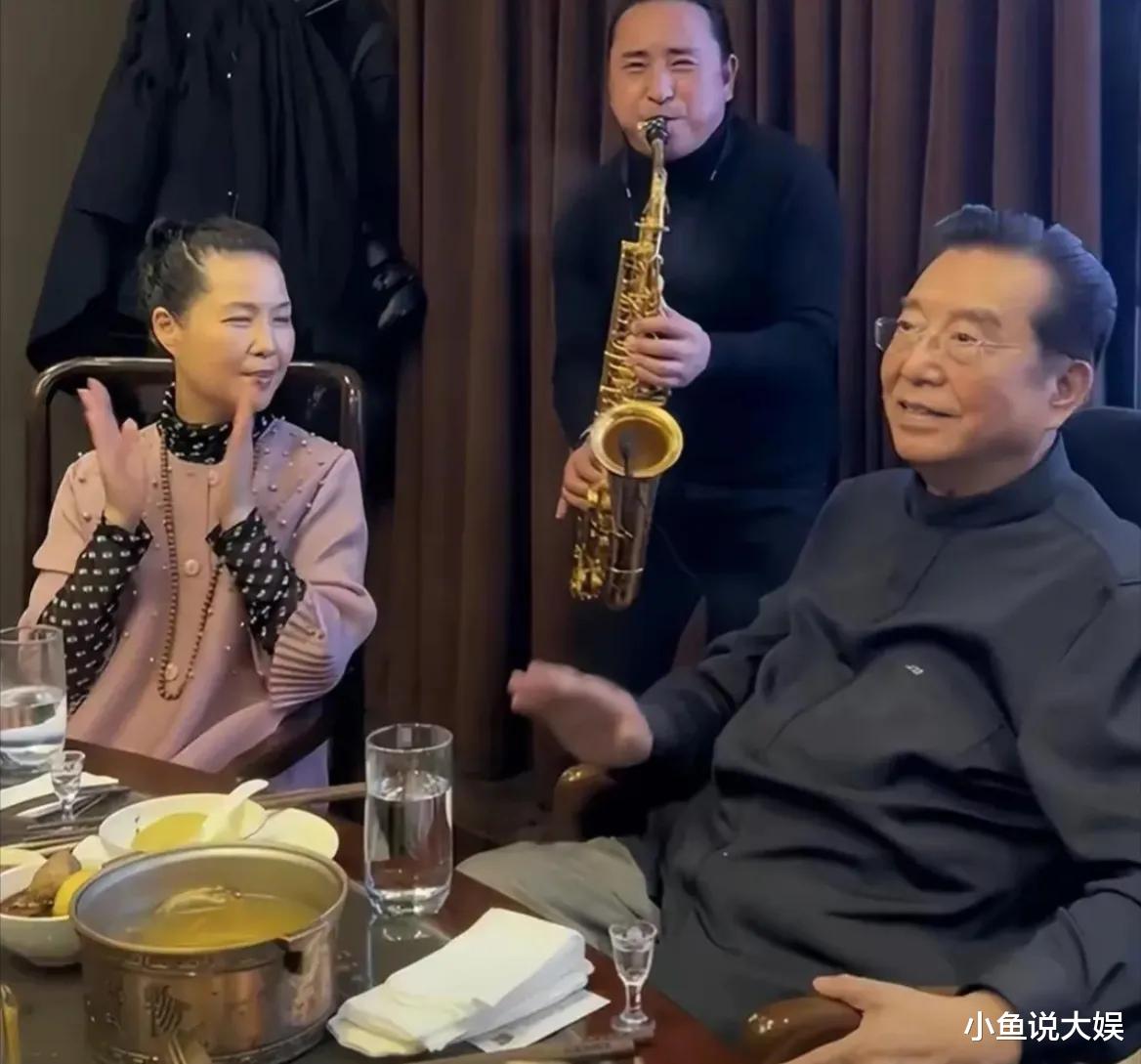 夫妻两人喝着昂贵的白酒,一旁还有人吹着萨克斯,现场仿佛像是在庆祝什么喜悦之事。