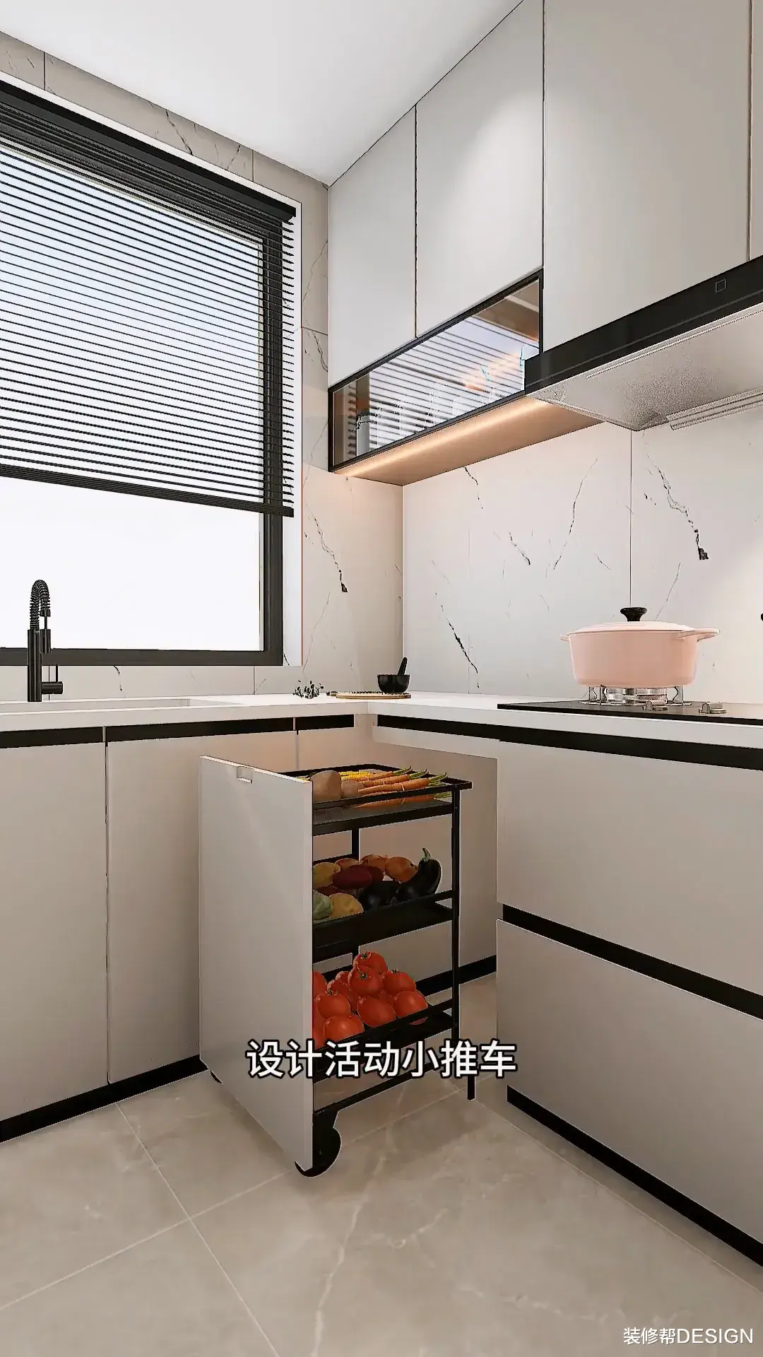 空出一节橱柜,设计活动小推车,日常使用更灵活。最上层是抽拉板,扩展台面空间,备餐更方便。