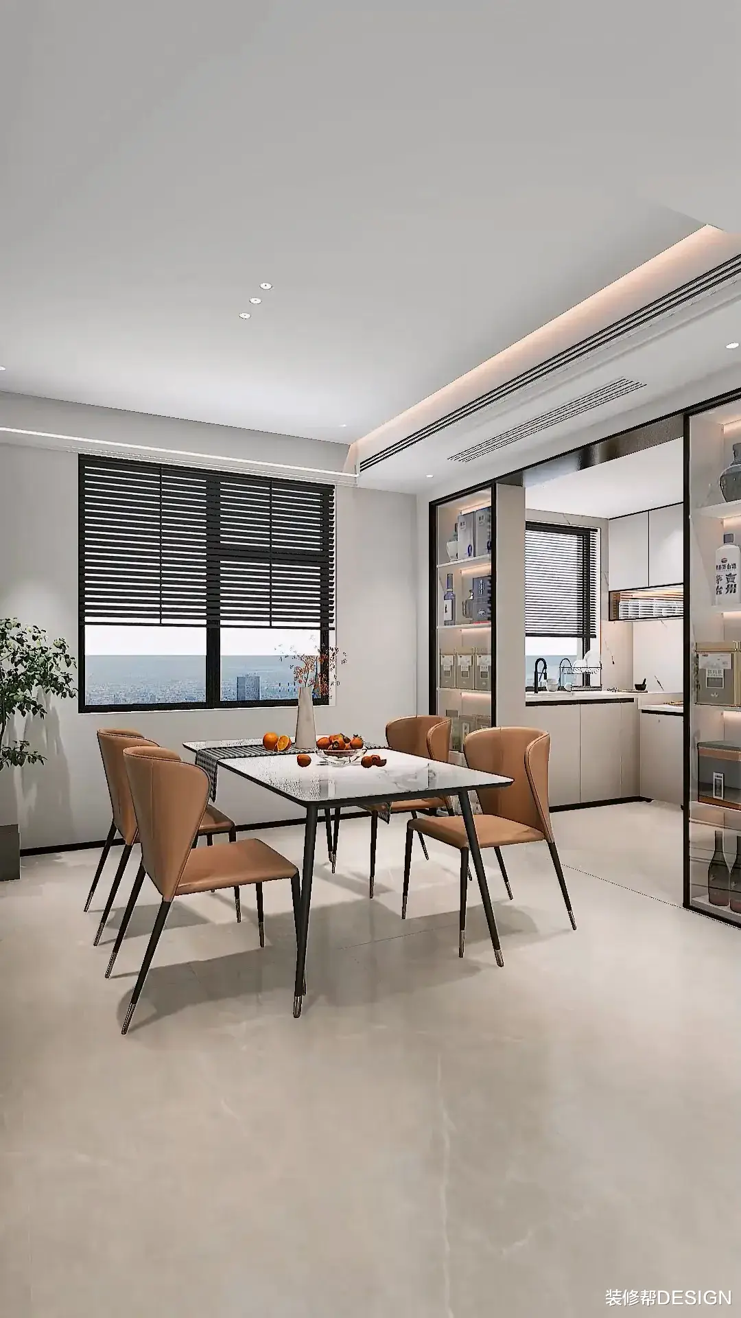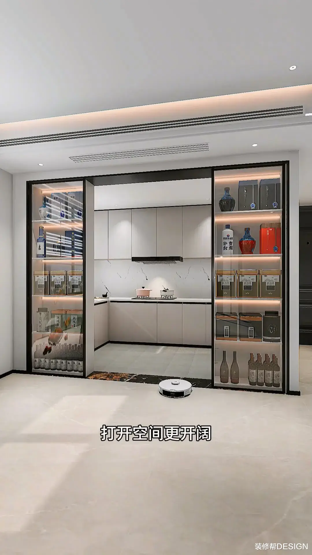 不装老式推拉门,同时只能开一扇,进出太拥挤,轨道还藏污纳垢,扫地机都进不去,而是拆掉非承重墙,设计对称式高柜,分开放茶叶酒水,安装吊轨推拉门,打开空间更开阔,再把大砖通铺至厨房,宽敞大气好打理。