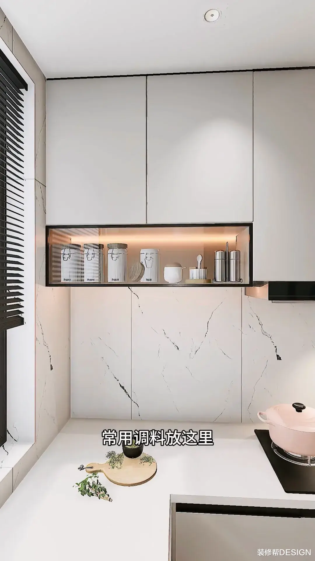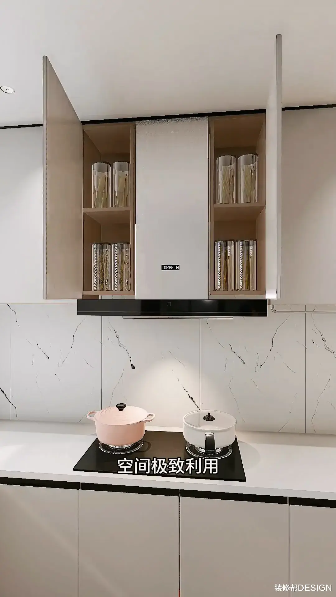 烟机两边做储物格,空间极致利用,再把左边吊柜缩短,增加玻璃上翻柜,常用调料放这里。