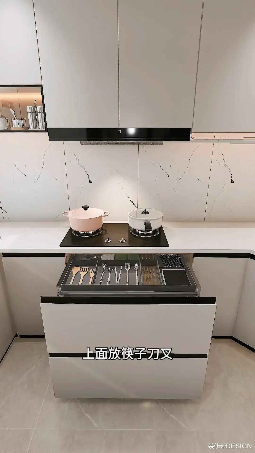地柜不做层板,而是做多层抽屉,上面放筷子、刀叉,下面放碗碟厨具。