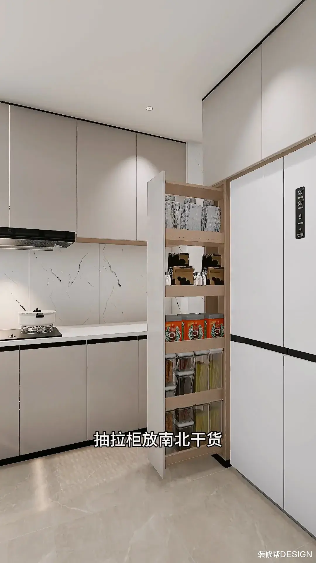 把冰箱右移,定制组合柜,高柜放不常用电器,抽拉柜放南北干货。