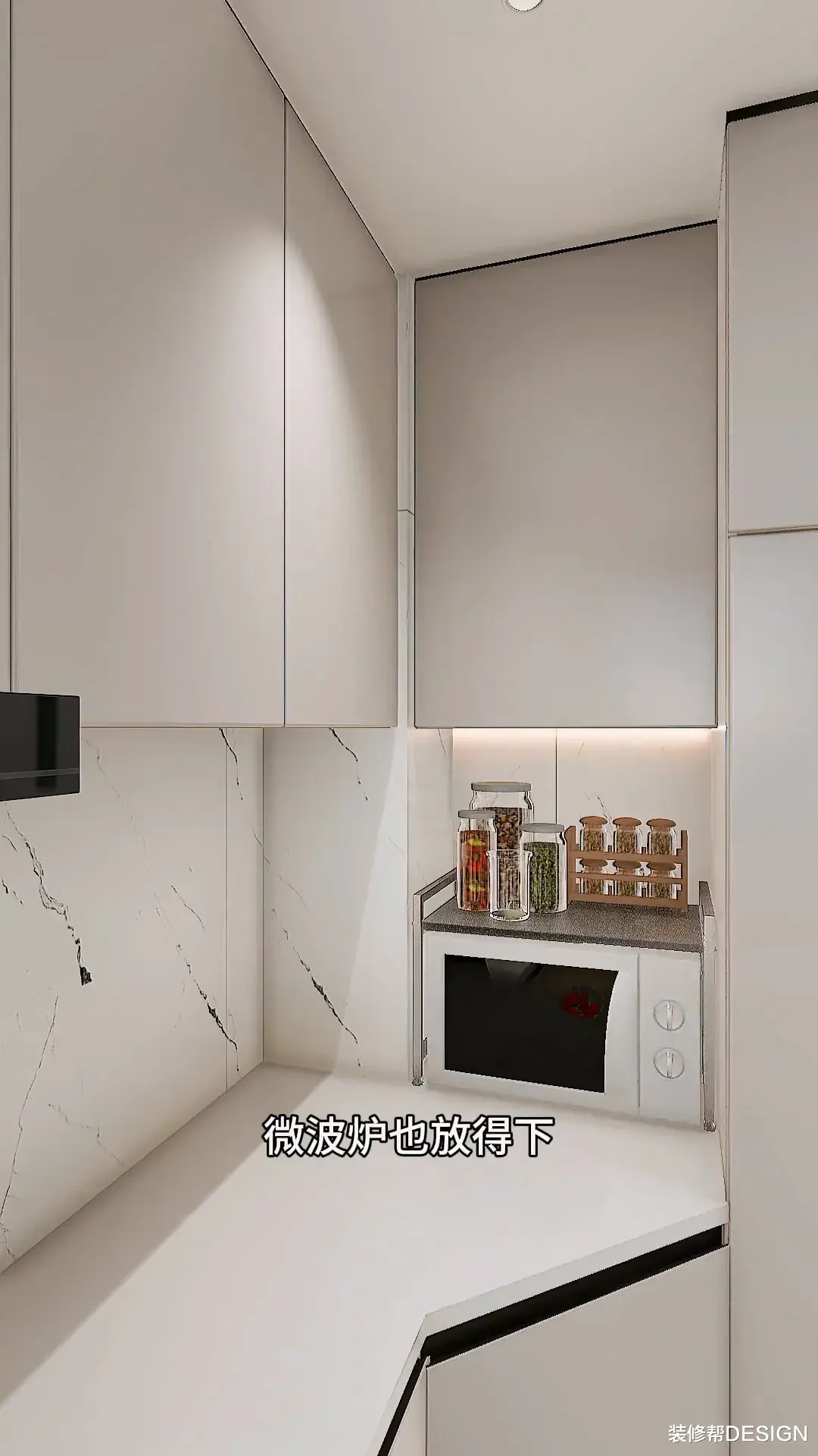 不做传统直角柜,角落改成钻石柜,收纳更多又好拿,上方做吊柜增加收纳,中间放个置物架,微波炉也放得下。
