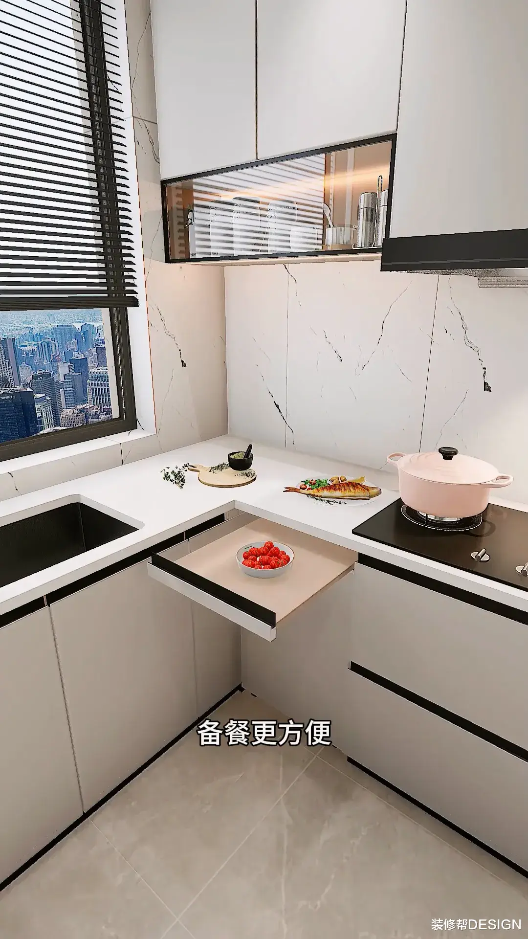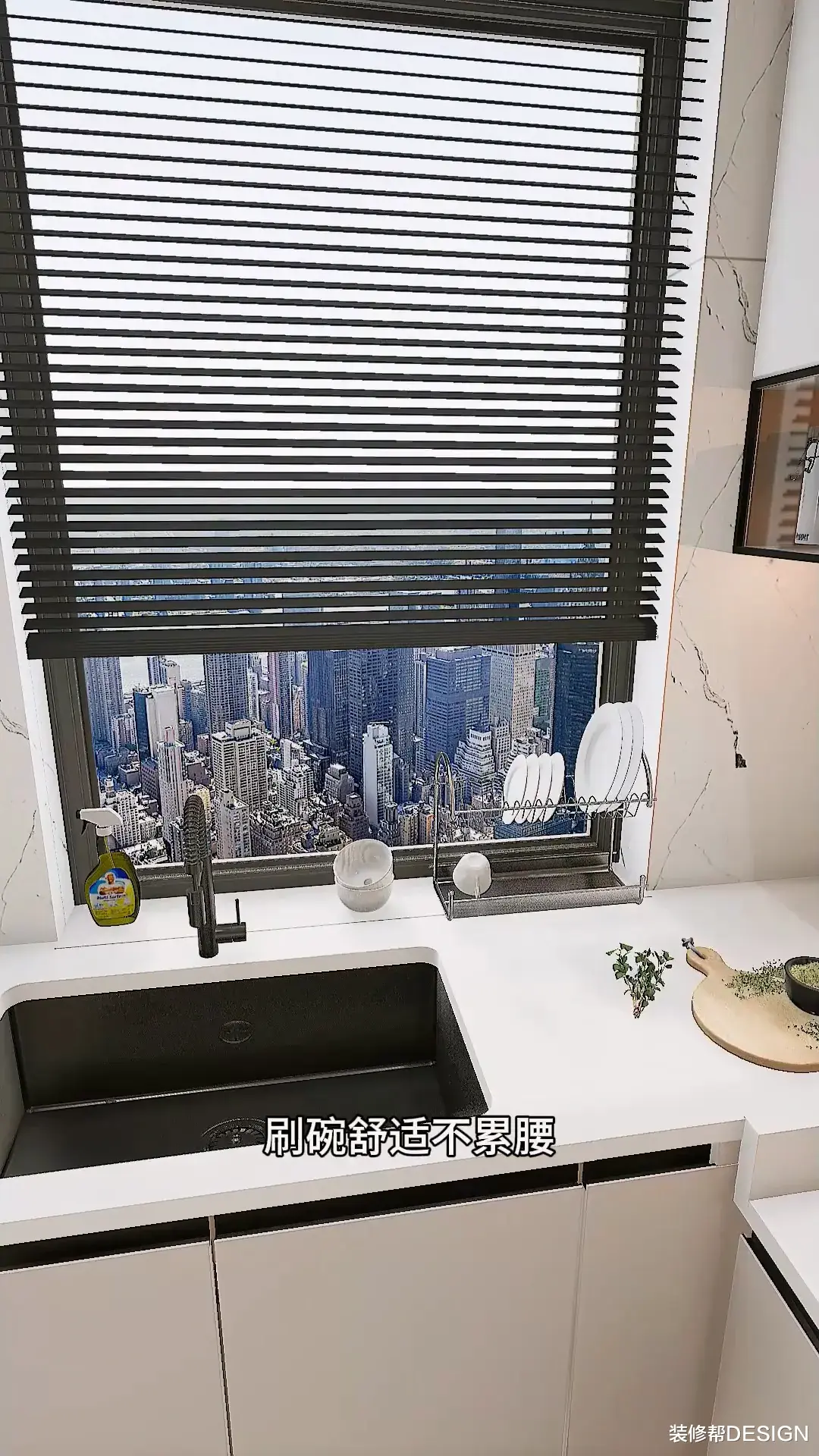 把水槽区抬高10公分,台面延伸至窗台,刷碗舒适不累腰。