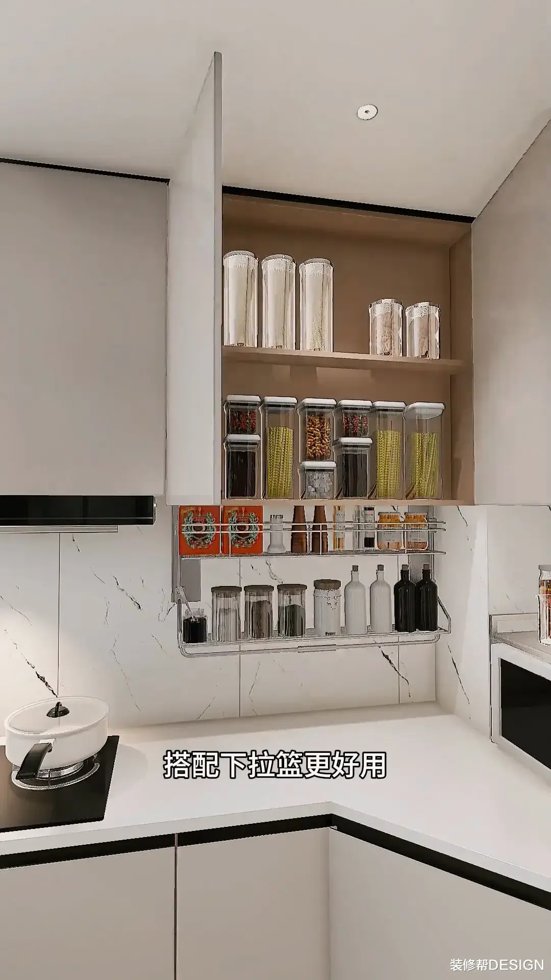 不做传统吊柜,而是改做两层,搭配下拉篮更好用。