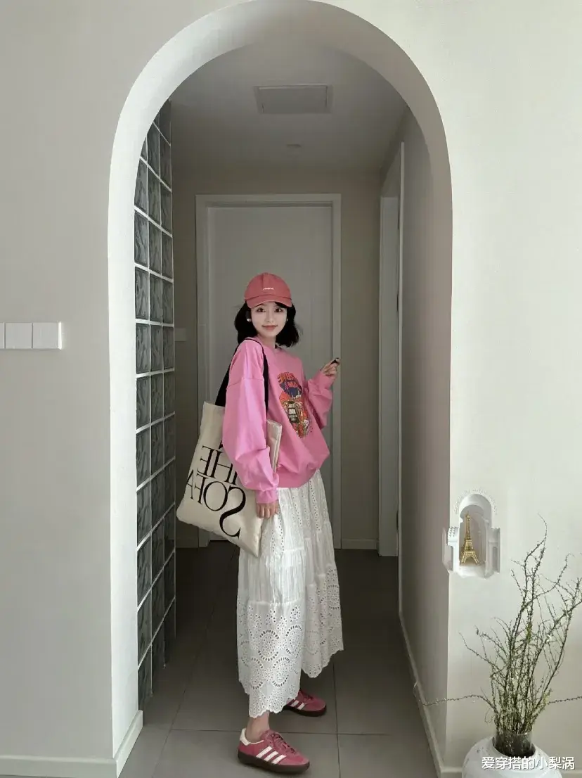 玫红色德训鞋太正了!有腰线鞋型超级显瘦,让脚踝看起来更加秀气。搭配玫红色卫衣和半身小白裙,清新甜美,减龄效果一绝,看上去就非常亮眼。