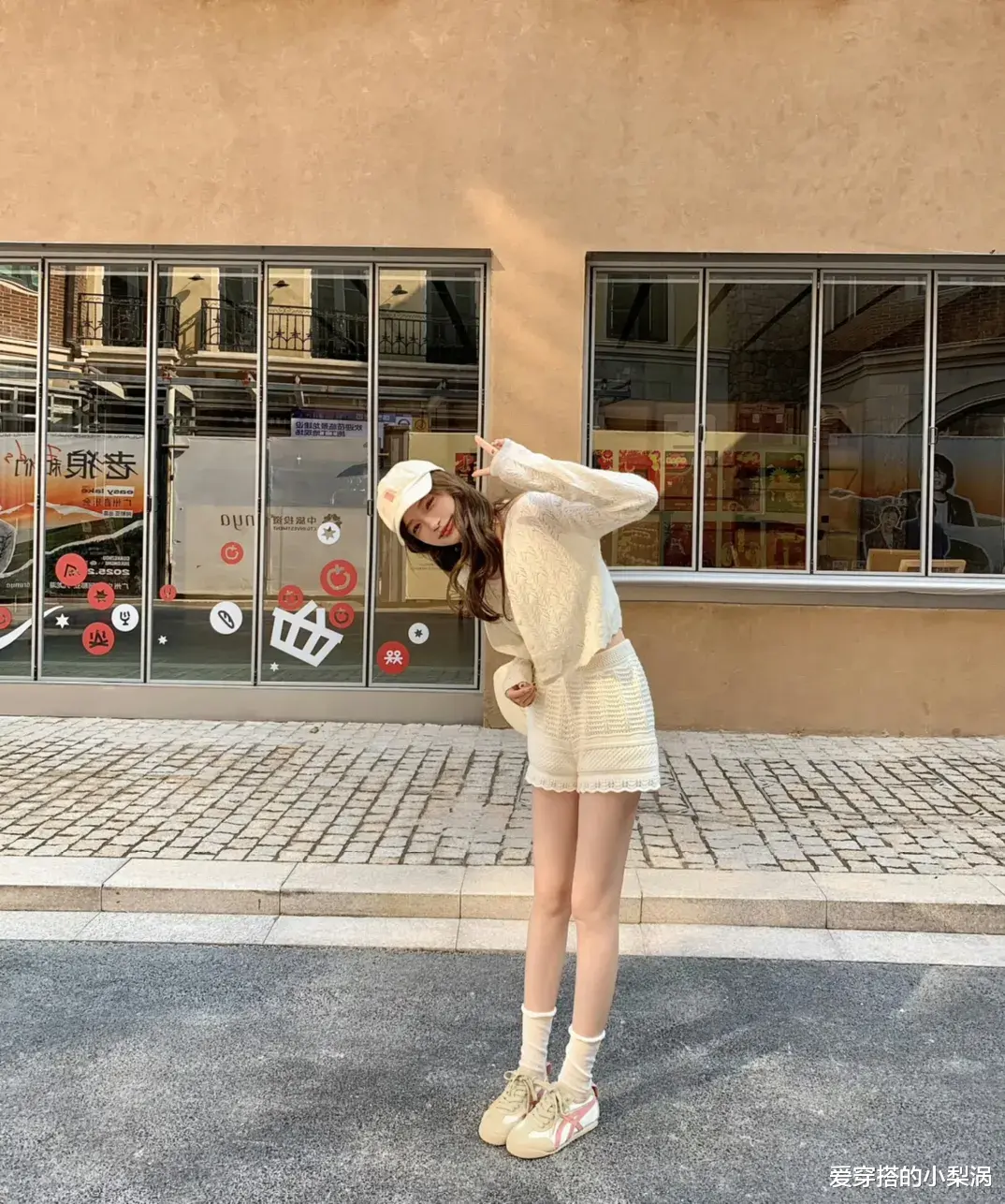 腿部线条很优越的女生,可以穿一双长袜,会让鞋子看起来更加有设计感,整体穿搭更趋于丰富和谐。搭配白色小短裤,会显得腿部修长纤细,超级养眼。04德训鞋+短裙丨俏皮活泼