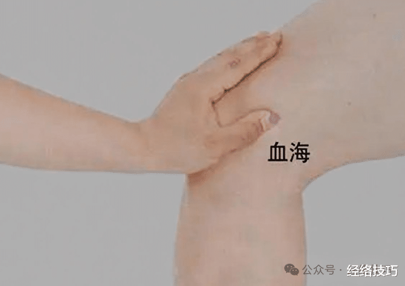 血海穴:好用的养气血穴位血海穴对调气血有辅助作用,坐直把腿伸直,膝盖内侧有个凹下去的地方,膝盖骨内侧往上两寸的地方就是;也能够用手掌盖住膝盖,拇指朝内,指尖按到的地方就是血海穴。