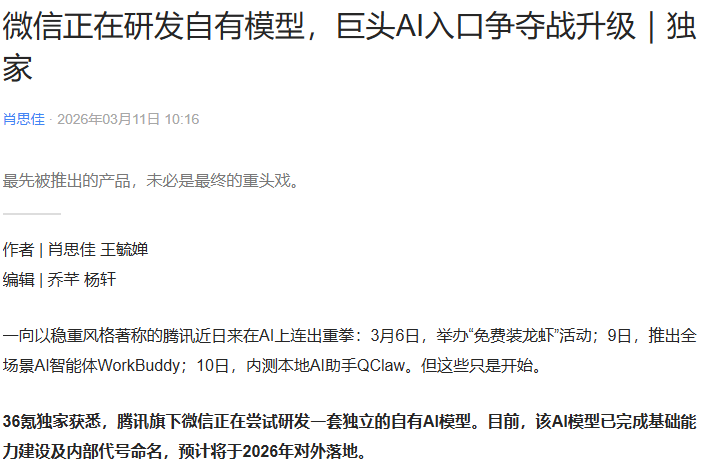 PChome 3月12日消息,据36氪独家报道,腾讯旗下微信正尝试研发一套独立的自有AI模型,目前已完成基础能力建设与内部代号命名,预计将于2026年对外落地。