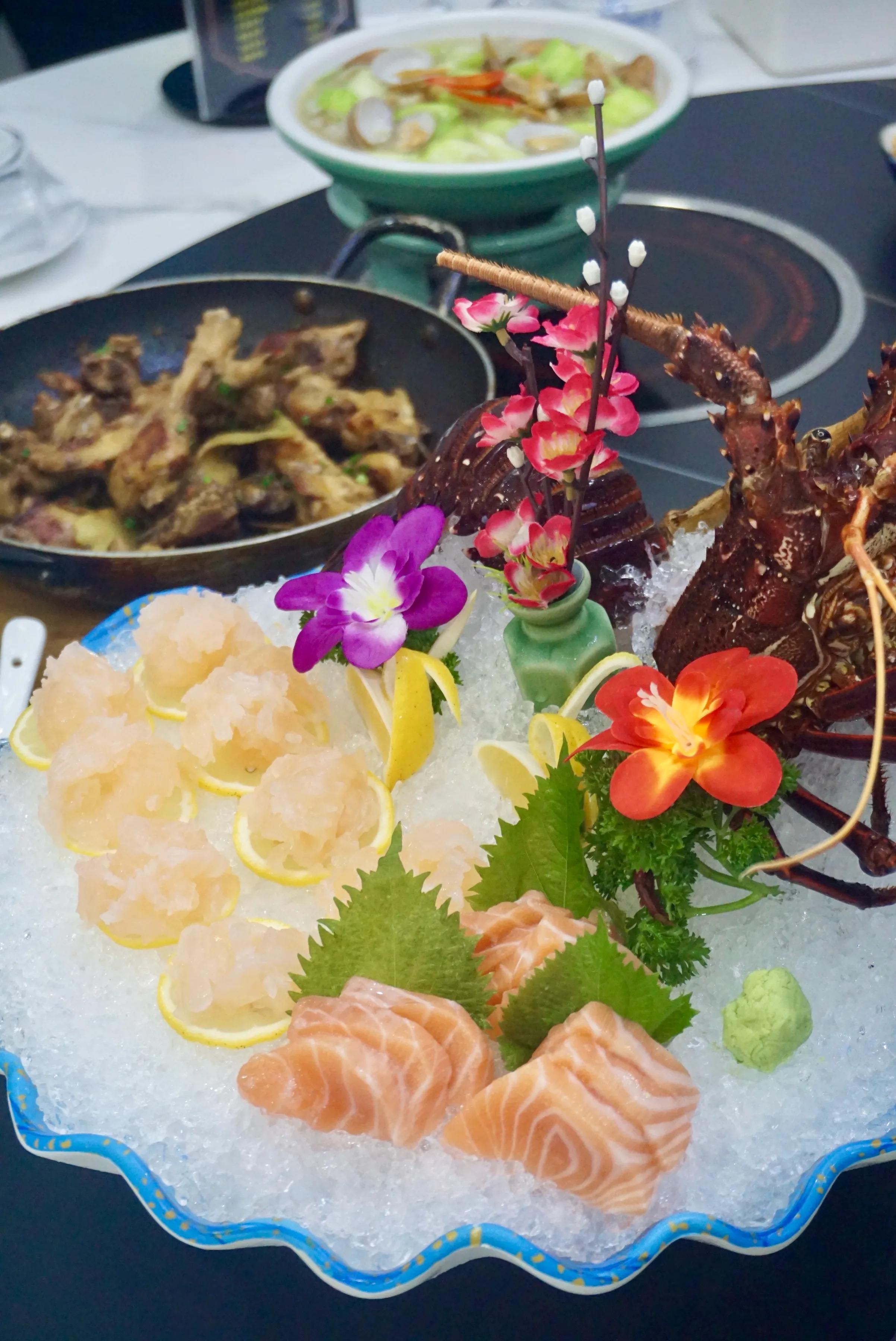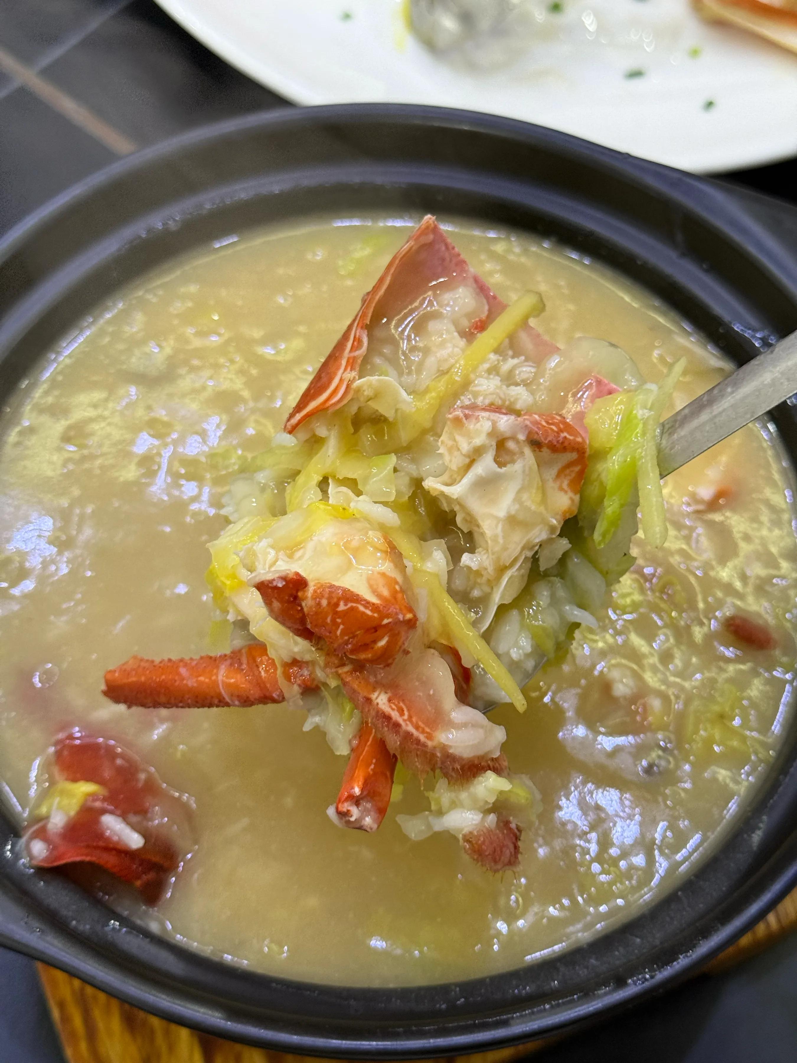 前一会儿还看着师傅从海鲜池里捞出来在活蹦乱跳的,这不大一会的功夫,澳龙已经上桌变身成为刺身了,和厚切三文鱼一起组合上桌。那甜美的澳龙刺身滋味,只有亲口吃到的才能体会到了!澳龙的头尾还可以煮海鲜粥,作为两吃的另一种吃法。这龙虾粥好喝到忍不住又多喝了好几碗的!